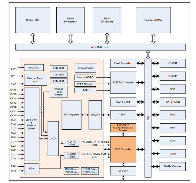 芯片內(nèi)置RTOS、鋰電池控制邏輯、電芯均衡邏輯和SOX(SOH、SOC、SOP、SOE)深度學(xué)習(xí)預(yù)測模型,客戶無需編程通過參數(shù)選擇就能快速完成BMS系統(tǒng).